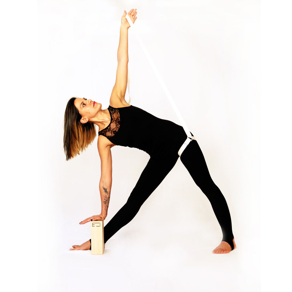 Correa de algodón con doble hebilla metálica, ideal para estiramientos y alineaciones.