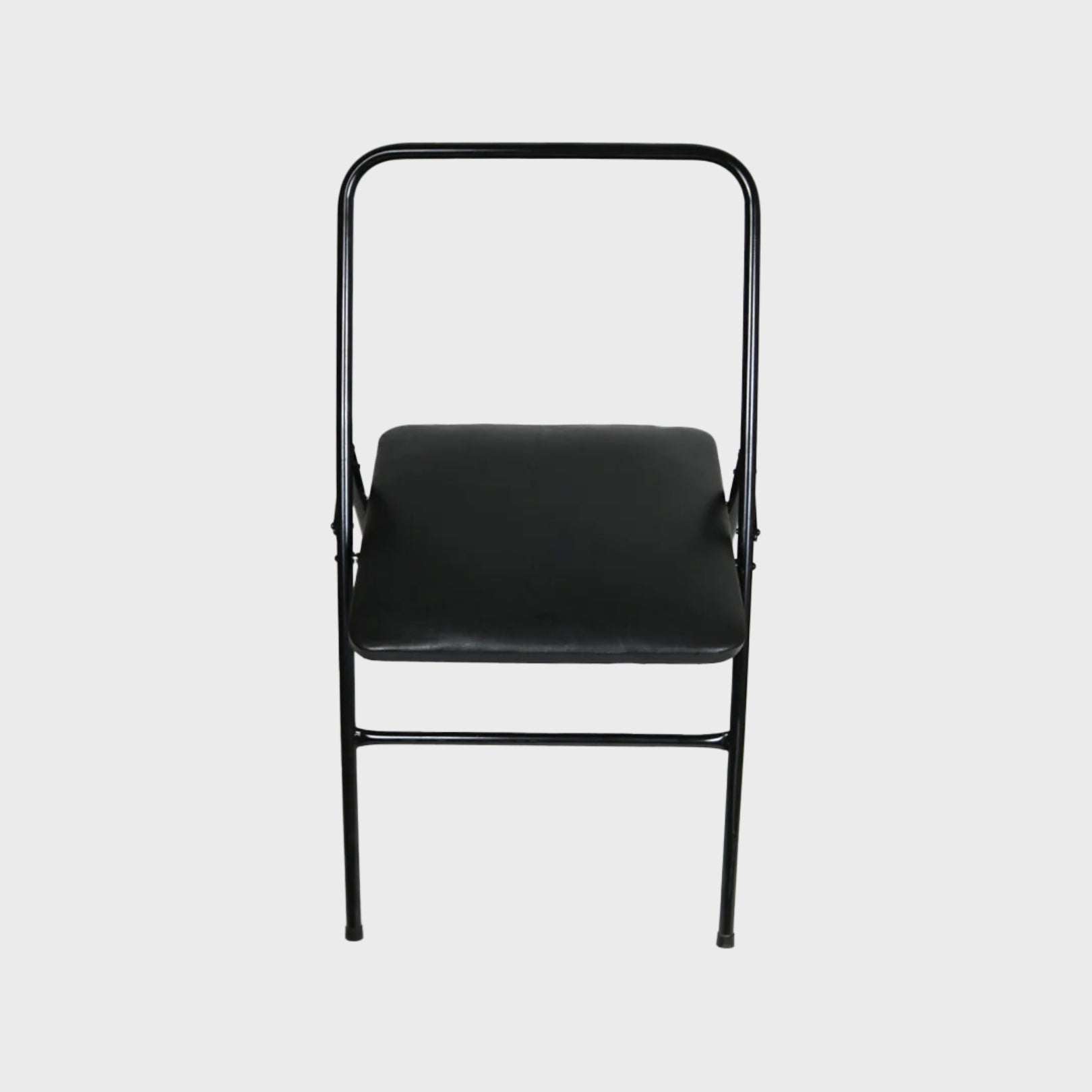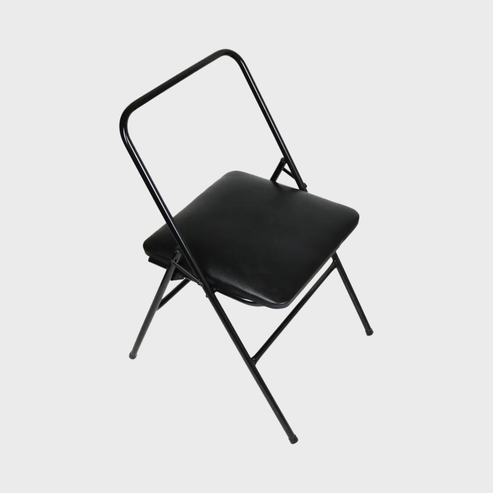Nuestra silla de yoga plegable, de fierro de 20mm. que le da gran resistencia, con asiento acolchado con cuerina negra, topes plásticos para mejorar su agarre y lacada negra. Se puede almacenar y transportar cómodamente.