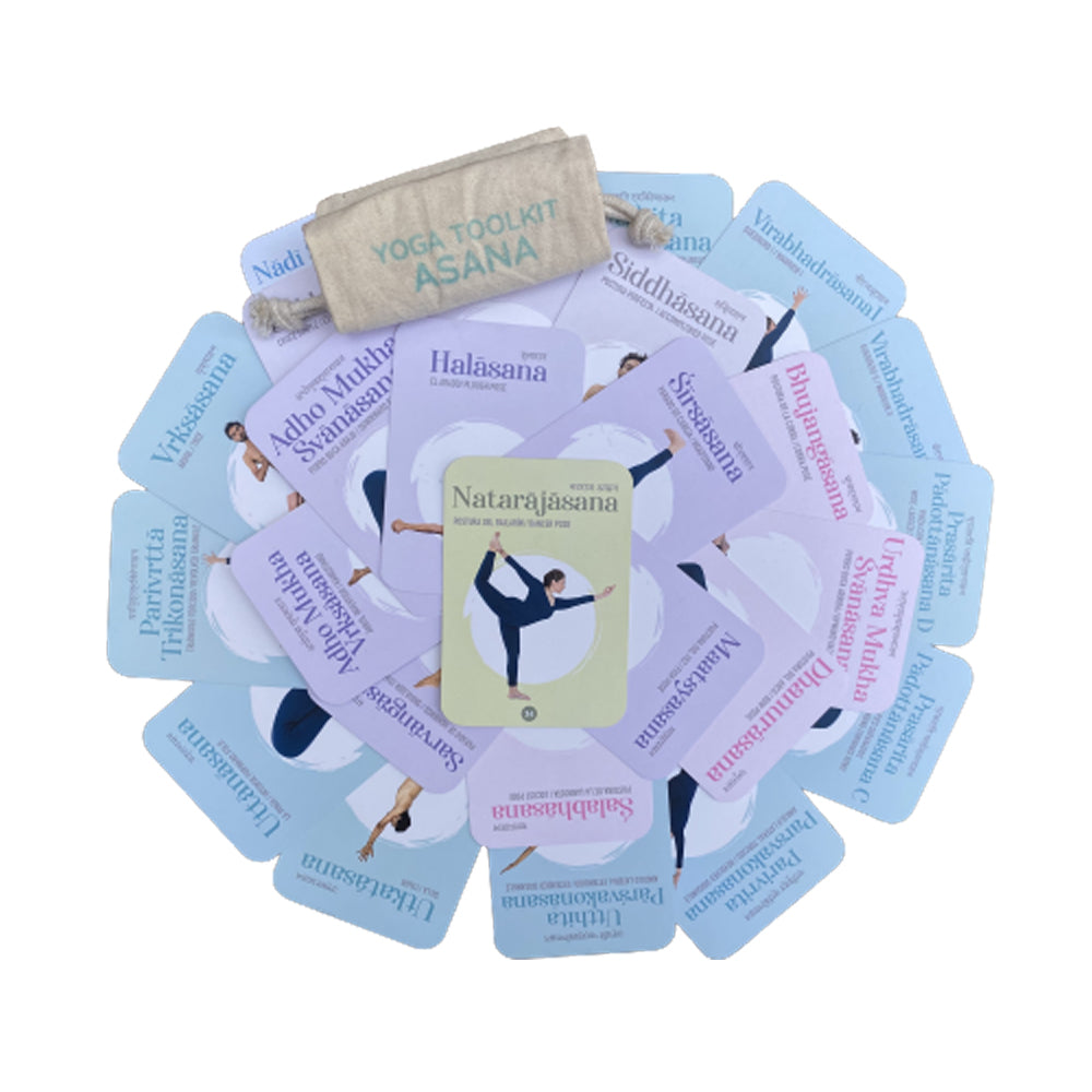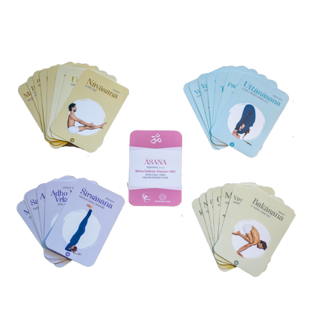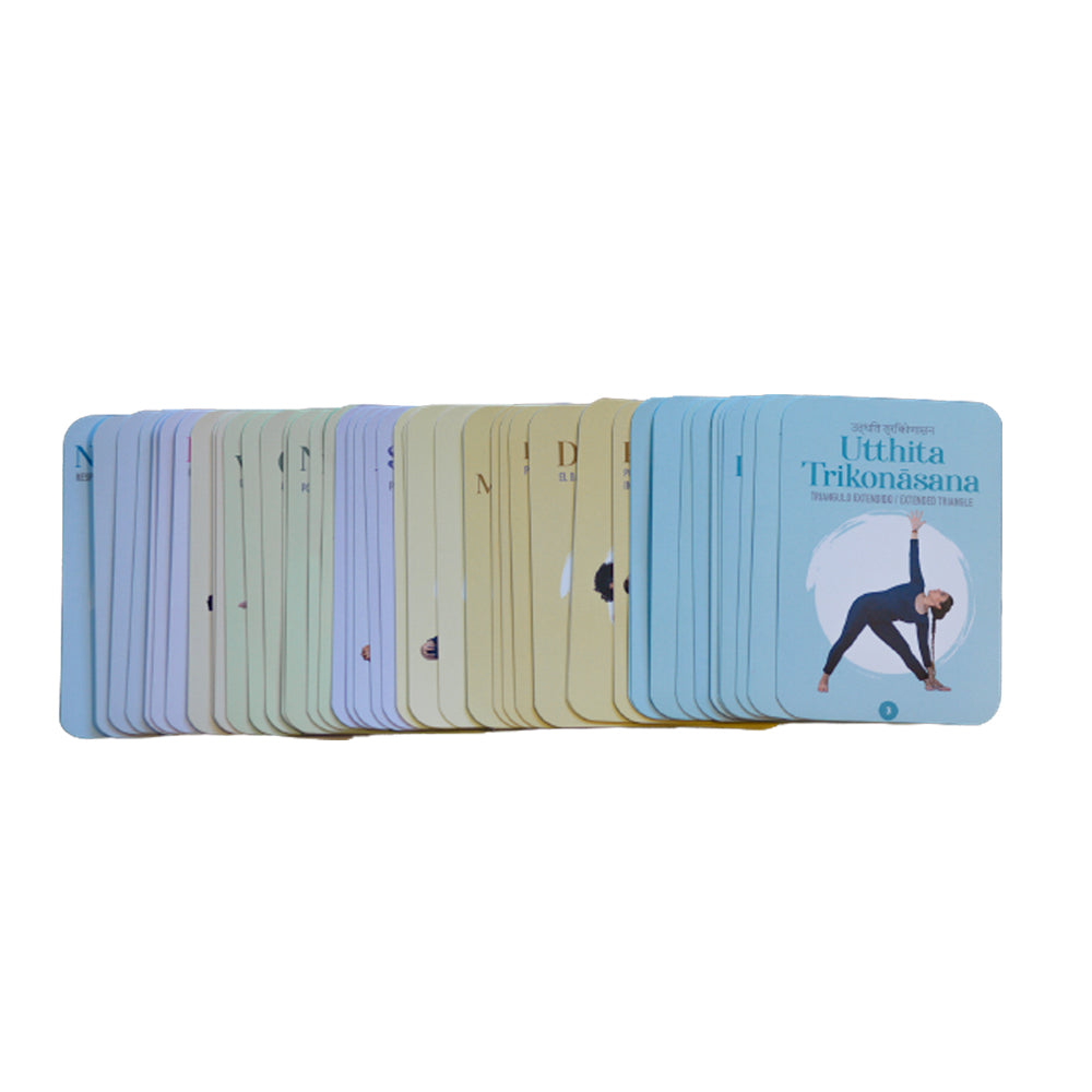Cada tarjeta muestra por un lado la imagen de la postura final, y por el otro sus instrucciones y beneficios.